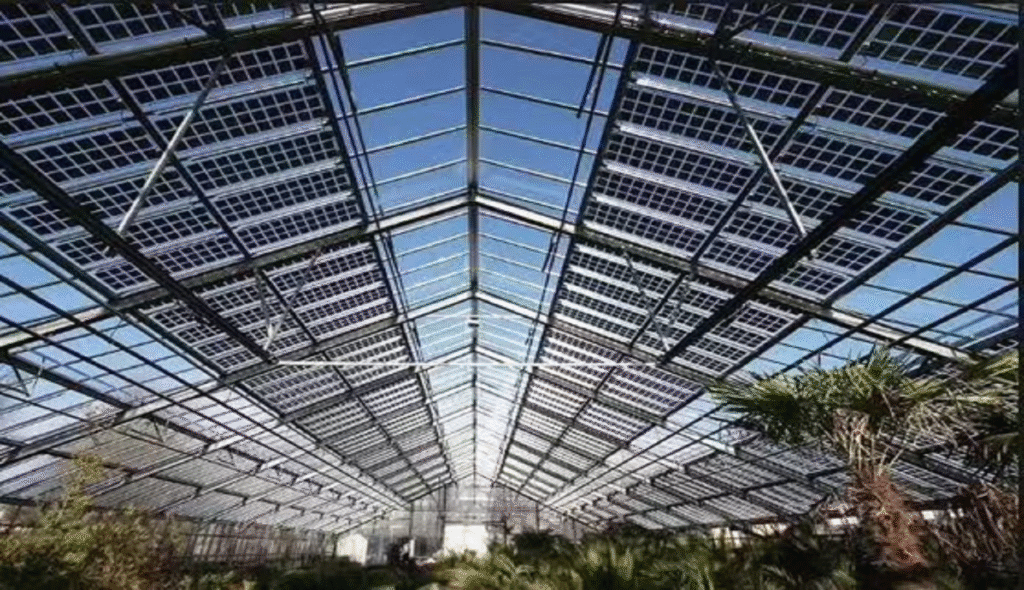 The application of BIPV (Building Integrated Photovoltaic) glass: on ecological greenhouses, inside buildings, and with various colors available for selection, such as black, red, silver, and so on.