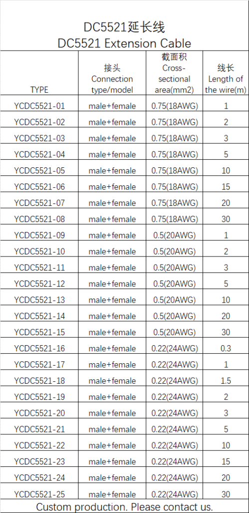 DC5521/25 Extension Cable Specifications